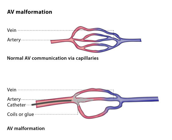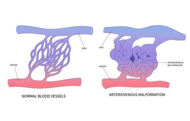 An Arteriovenous Malformation (AVM) is an abnormal connection between arteries and veins, bypassing the normal capillary system. This causes irregular blood flow, which can lead to pain, swelling, bleeding, and in severe cases, life-threatening complications. AVMs can occur anywhere in the body but are most commonly found in the brain, spine, or extremities.